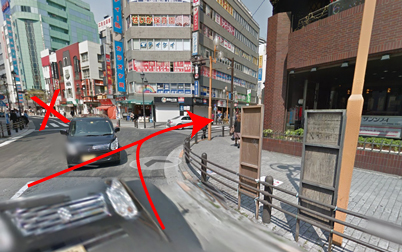 正面に「珈琲伯爵さん」道を挟んで「携帯の王様さん」があります。 この間の道(文化通り)に入ってください。 絶対にマルイ方面には行きませんのでご注意ください。 |