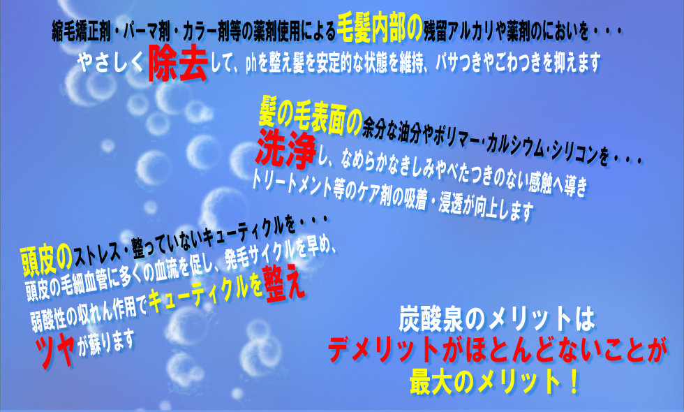 炭酸泉とは、炭酸ガス(二酸化炭素)が溶け込んだお湯の事です。 中でもお湯1Lに炭酸ガスが1g(1000ppm)以上溶けたものは特に効果が高い療養泉として医療の分野でも大変注目されています。 お湯に溶けた炭酸ガスは皮膚を通り抜けて皮下の毛細血管に入って行きます。 すると脳が酸欠と察知し、毛細血管に流れ込む血液の量を増やすため、血行や新陳代謝が促進される効果があります。 この炭酸泉は、美容室での施術においても様々な場面で効果を発揮します。 ラ・ムー池袋で導入している炭酸泉も中空糸膜方式により1000ppmの濃度を実現しています。 シャンプーだけでは落ちきれない頭皮の汚れや髪に残留している古くなったシリコンやポリマー等の酸化物を除去する効果があります。 髪本来の状態に戻る事により、その後に使用するトリートメントの浸透、定着が良くなるのみならず、 縮毛矯正・パーマ・カラー等の薬剤も的確に作用しやすい状態になります。 また、縮毛矯正の中間処理や後処理、カラーのシャンプーの際に使用する事で残留薬剤を除去しアフターダメージを防ぎ、 髪や頭皮・薬剤の臭いも取り除いてくれます。 |