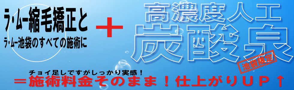 パーマー・カラー・トリートメント等シャワーを使用する全メニューにこの炭酸泉をプラス料金\0で使用しております。 ※高濃度人工炭酸泉はラ・ムー池袋でしか扱っておりません。ラ・ムー板橋・プレミアムにはございませんのでご了承ください。 |